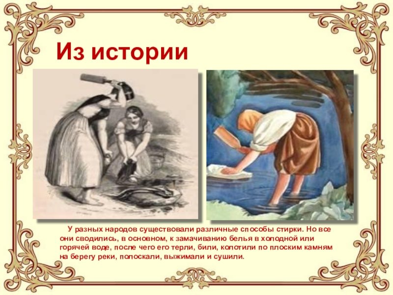 Из истории У разных народов существовали различные способы стирки. Но все они сводились, в основном, к замачиванию белья в холодной или горячей воде, после чего его терли,