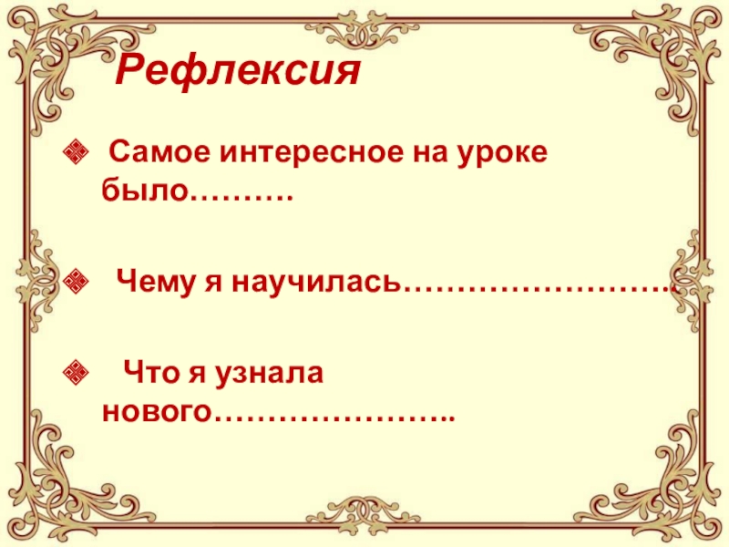 Рефлексия Самое интересное на уроке было………. Чему я научилась……………………..   Что я