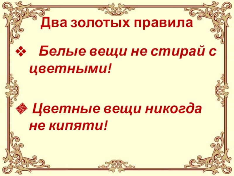 Два золотых правила  Белые вещи не стирай с       цветными! Цветные