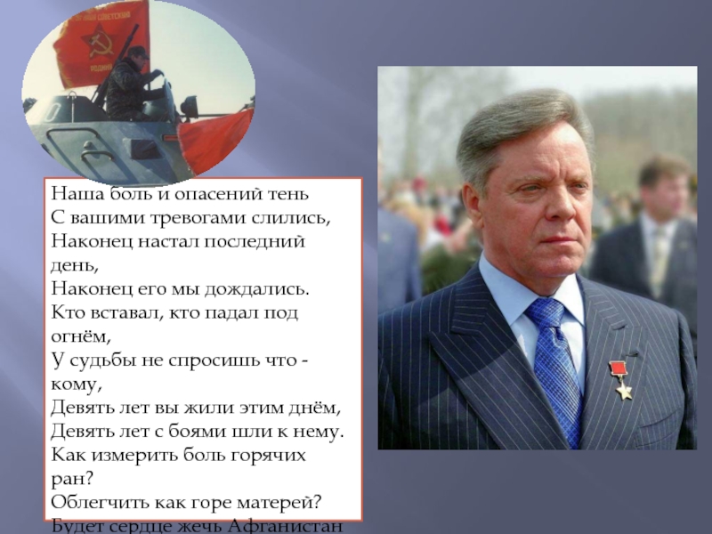 его мы дождались.  Кто вставал, кто падал под огнём,  У судьбы не спросишь что - кому,  Девять лет вы жили этим днём,  Девять лет с боями шли к нему.  Как измерить боль горячих ран?  Облегчить как горе матерей?  Будет сердце жечь Афганистан  И в объятьях Родины своей.
