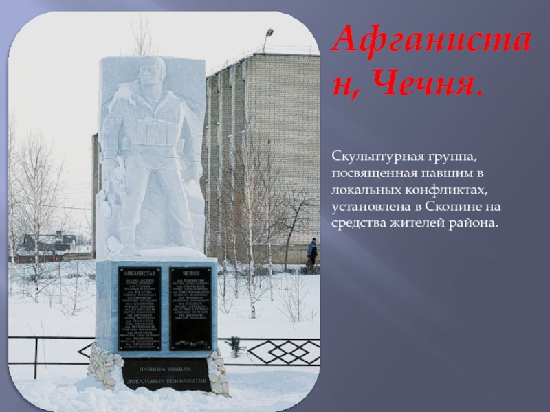 Афганистан, Чечня.Скульптурная группа, посвященная павшим в локальных конфликтах, установлена в Скопине на средства жителей района.