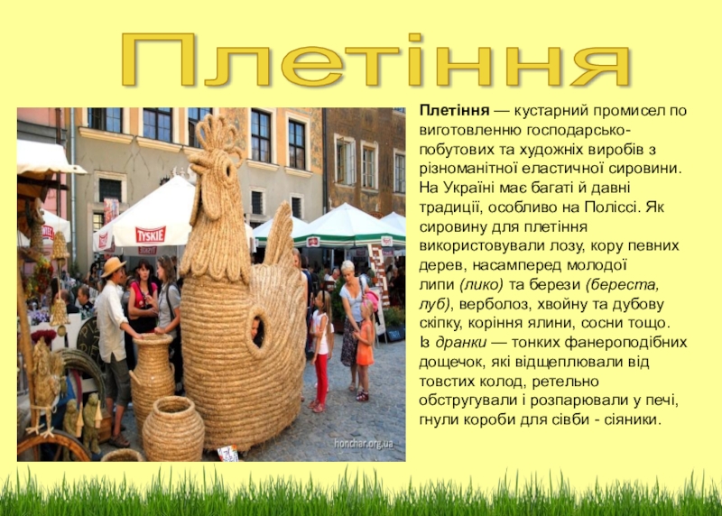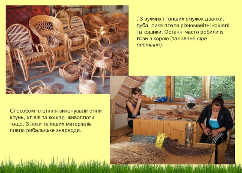 Способом плетіння виконували стіни клунь, хлівів та кошар, живоплоти тощо. З лози та інших матеріалів плели рибальське знаряддя.