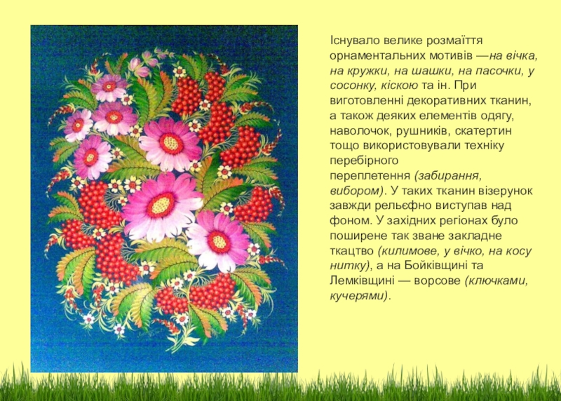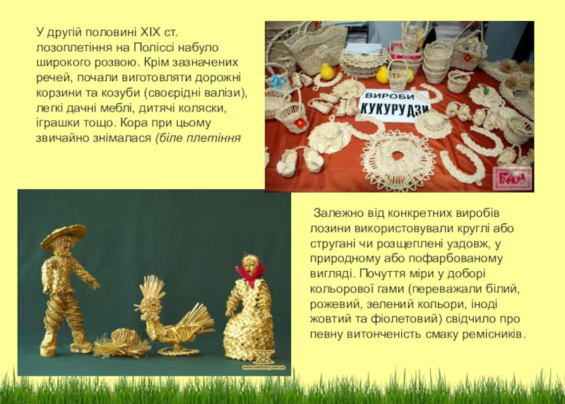 Залежно від конкретних виробів лозини використовували круглі або стругані чи розщеплені уздовж, у природному або пофарбованому вигляді. Почуття міри у доборі кольорової гами (переважали білий, рожевий, зелений кольори, іноді жовтий та фіолетовий) свідчило про певну витонченість смаку ремісників.