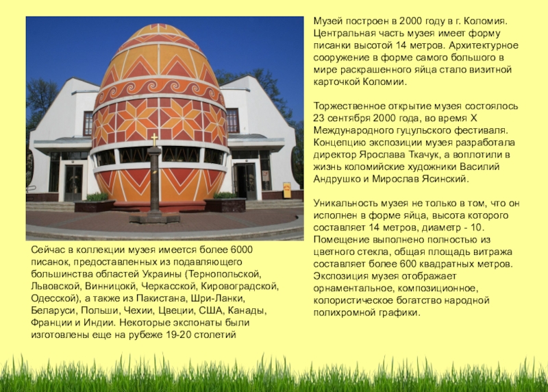 Сейчас в коллекции музея имеется более 6000 писанок, предоставленных из подавляющего большинства областей Украины (Тернопольской, Львовской, Винницокй, Черкасской, Кировоградской, Одесской), а также из Пакистана, Шри-Ланки, Беларуси, Польши, Чехии, Цвеции, США, Канады, Франции и Индии. Некоторые экспонаты были изготовлены еще на рубеже 19-20 столетий