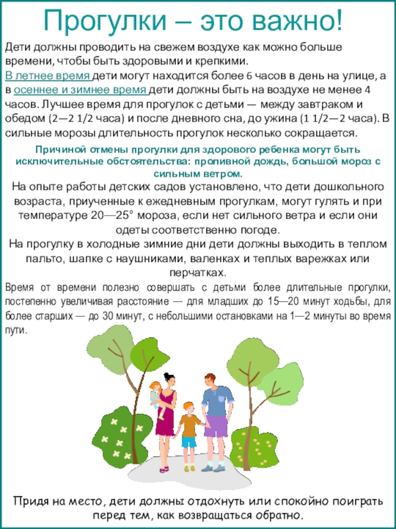 Время от времени полезно совершать с детьми более длительные прогулки, постепенно увеличивая расстояние — для младших до 15—20 минут ходьбы, для более старших — до 30 минут, с небольшими остановками на 1—2 минуты во время пути.
