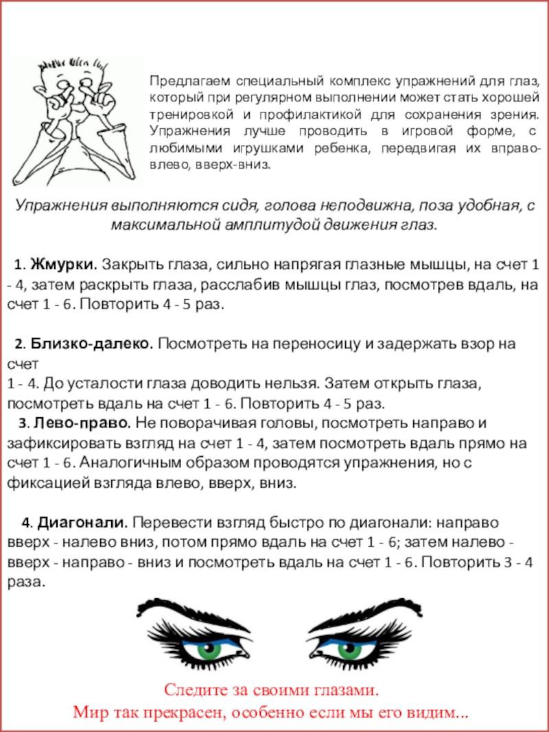 1. Жмурки. Закрыть глаза, сильно напрягая глазные мышцы, на счет 1 - 4, затем раскрыть глаза, расслабив мышцы глаз, посмотрев вдаль, на счет 1 - 6. Повторить 4 - 5 раз.