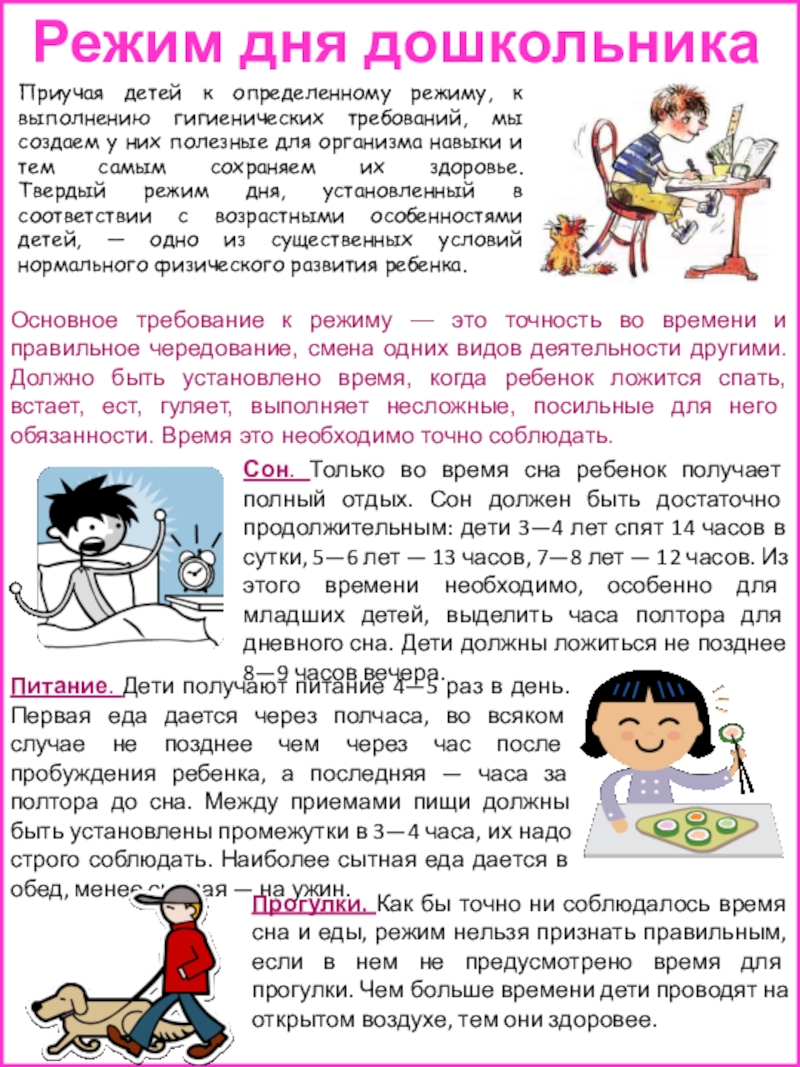 Основное требование к режиму — это точность во времени и правильное чередование, смена одних видов деятельности другими.