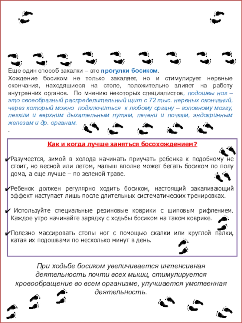Еще один способ закалки – это прогулки босиком.