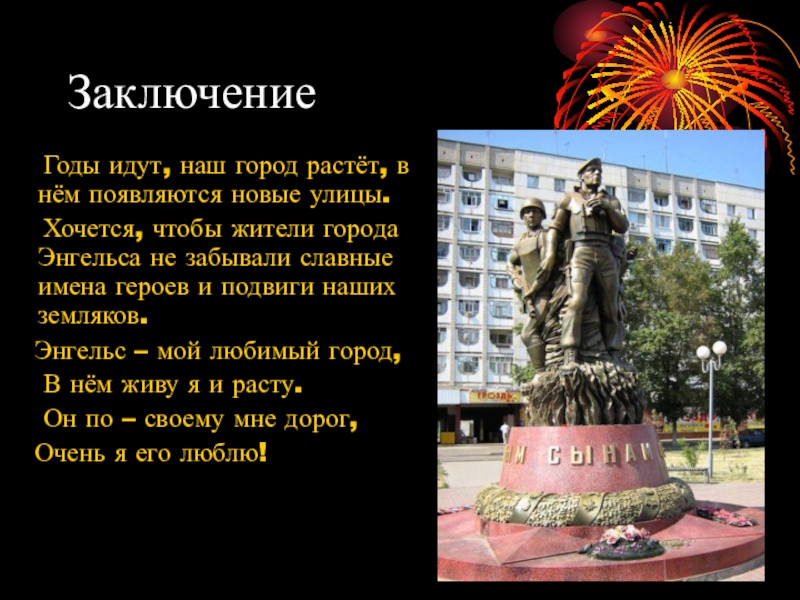 Хочется, чтобы жители города Энгельса не забывали славные имена героев и подвиги наших земляков.