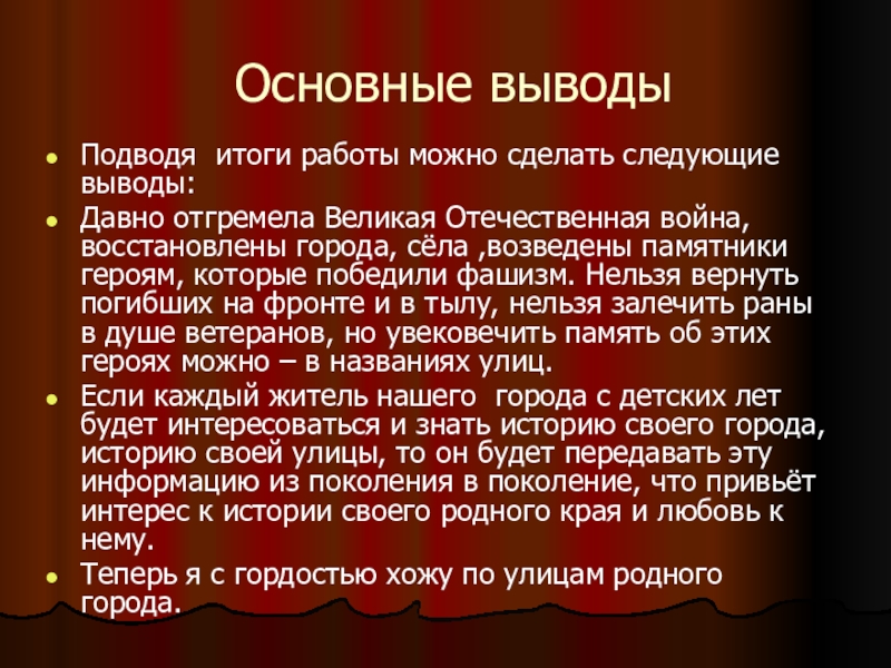 Если каждый житель нашего города с детских лет будет интересоваться и знать историю своего города, историю своей улицы, то он будет передавать эту информацию из поколения в поколение, что привьёт интерес к истории своего родного края и любовь к нему.