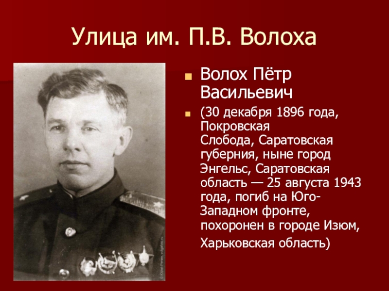 губерния, ныне город Энгельс, Саратовская область — 25 августа 1943 года, погиб на Юго-Западном фронте, похоронен в городе Изюм, Харьковская область)