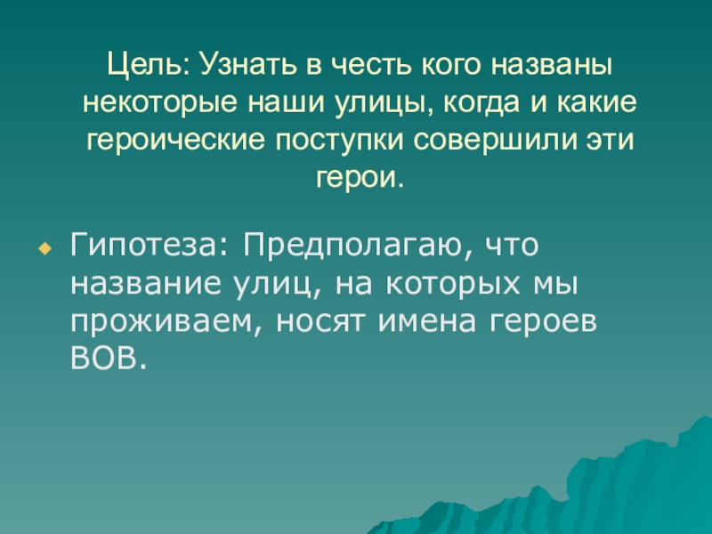 Гипотеза: Предполагаю, что название улиц, на которых мы проживаем, носят имена героев ВОВ.