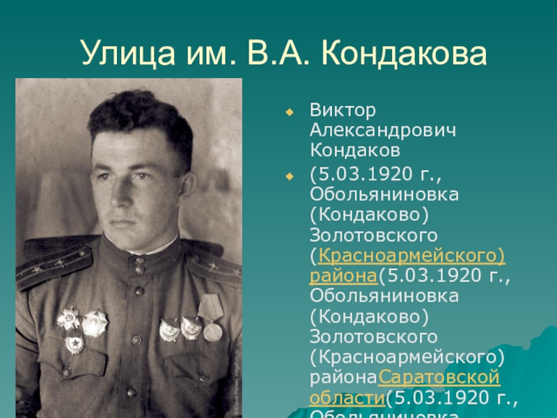Обольяниновка (Кондаково) Золотовского (Красноармейского) районаСаратовской области(5.03.1920 г., Обольяниновка (Кондаково) Золотовского (Красноармейского) районаСаратовской области — 13.10.1944 г.) — Герой Советского Союза.