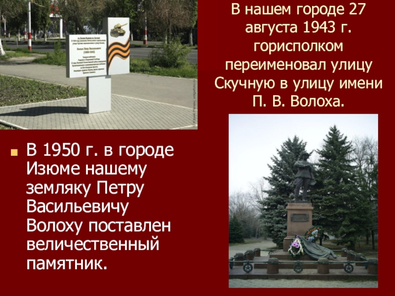 В 1950 г. в городе Изюме нашему земляку Петру Васильевичу Волоху поставлен величественный памятник.
