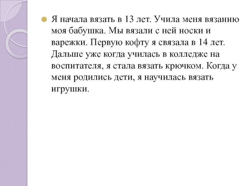 Слайд 10Я начала вязать в 13 лет. Учила меня вязанию моя бабушка.