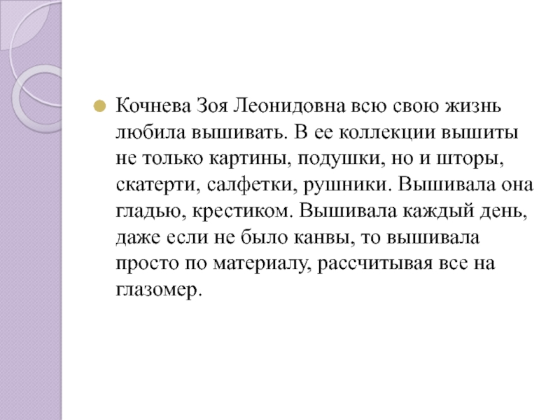 Слайд 5Кочнева Зоя Леонидовна всю свою жизнь любила вышивать. В ее коллекции