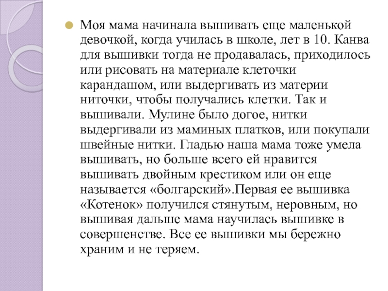 Слайд 7Моя мама начинала вышивать еще маленькой девочкой, когда училась в школе,