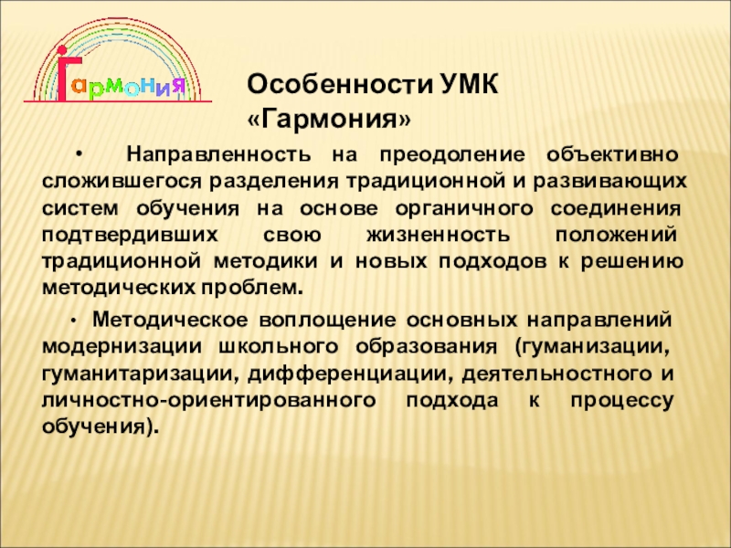 • Методическое воплощение основных направлений модернизации школьного образования (гуманизации, гуманитаризации, дифференциации, деятельностного и личностно-ориентированного подхода к процессу обучения).