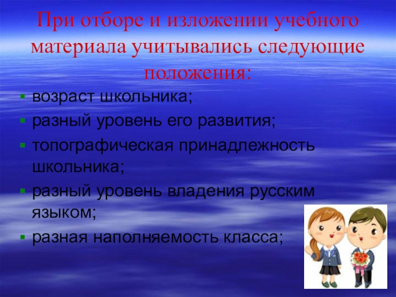 Слайд 8При отборе и изложении учебного материала учитывались следующие положения: