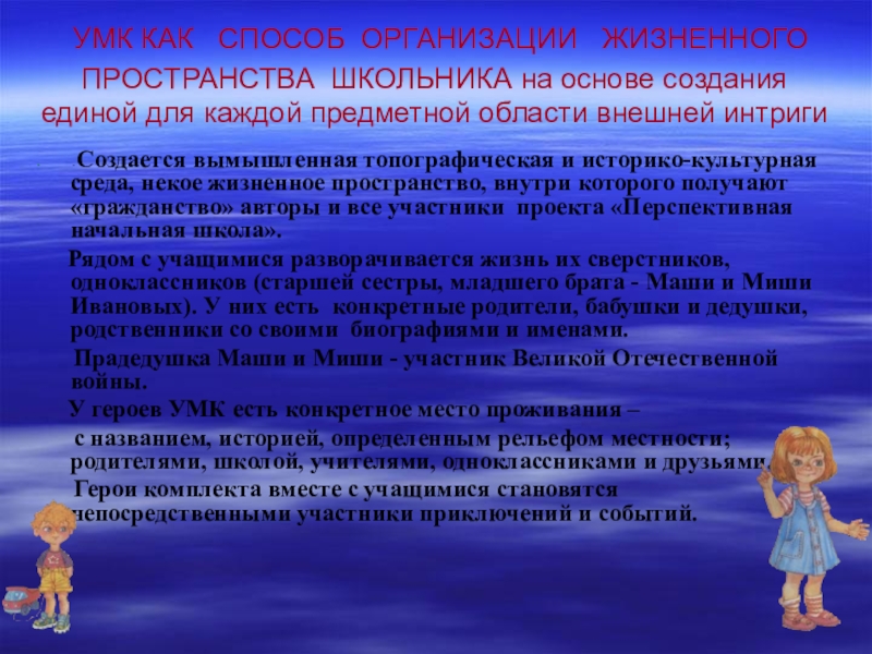 - Создается вымышленная топографическая и историко-культурная среда, некое жизненное пространство, внутри которого получают «гражданство» авторы и все участники проекта «Перспективная начальная школа».