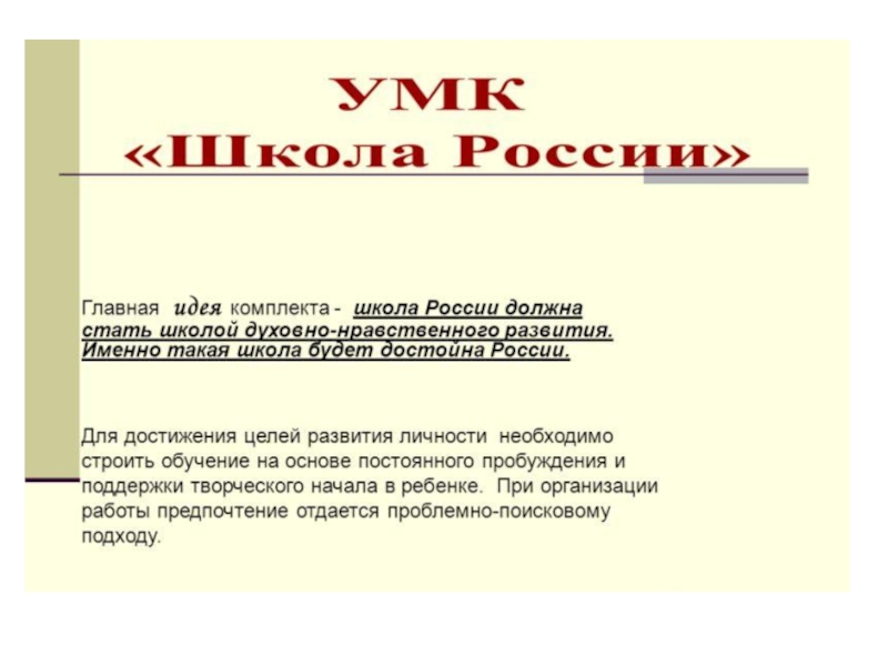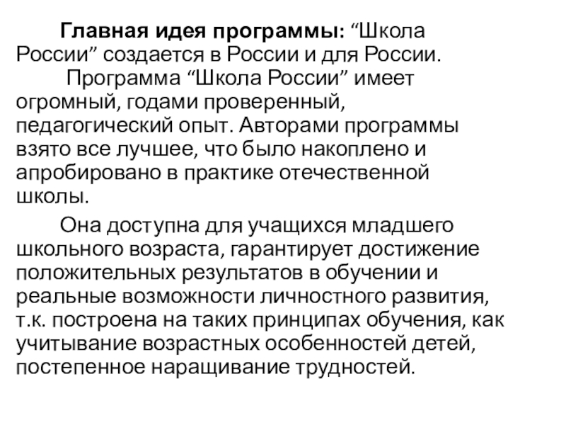 Главная идея программы: “Школа России” создается в России и для России. Программа “Школа России” имеет огромный, годами проверенный, педагогический опыт. Авторами программы взято все лучшее,