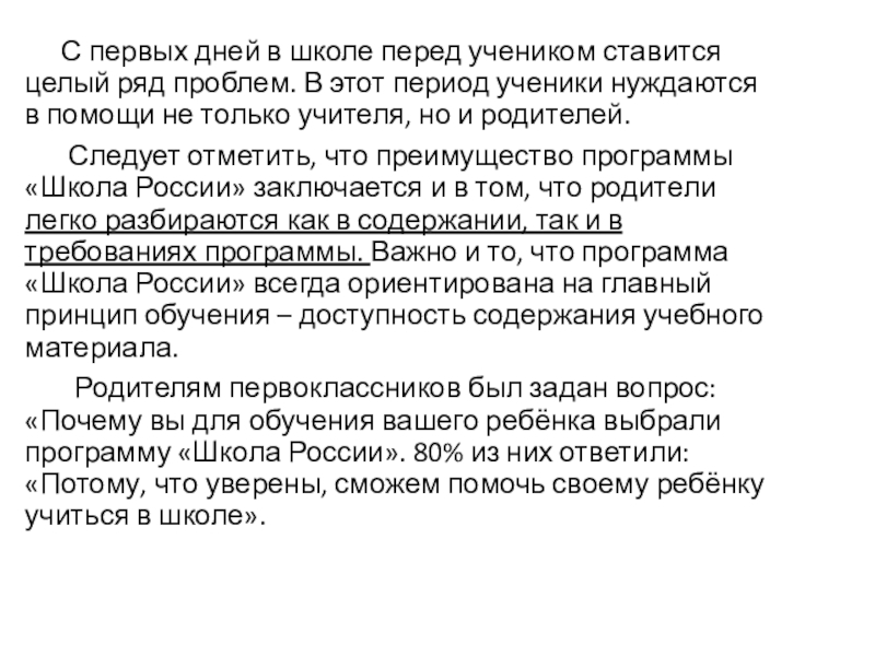 Родителям первоклассников был задан вопрос: «Почему вы для обучения вашего ребёнка выбрали программу «Школа России». 80% из них ответили: «Потому, что уверены, сможем помочь своему ребёнку учиться в школе».