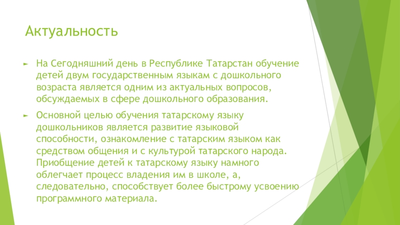 АктуальностьНа Сегодняшний день в Республике Татарстан обучение детей двум государственным языкам с дошкольного возраста является одним из актуальных вопросов, обсуждаемых в сфере дошкольного образования.Основной целью обучения татарскому языку дошкольников является развитие языковой способности, ознакомление с татарским