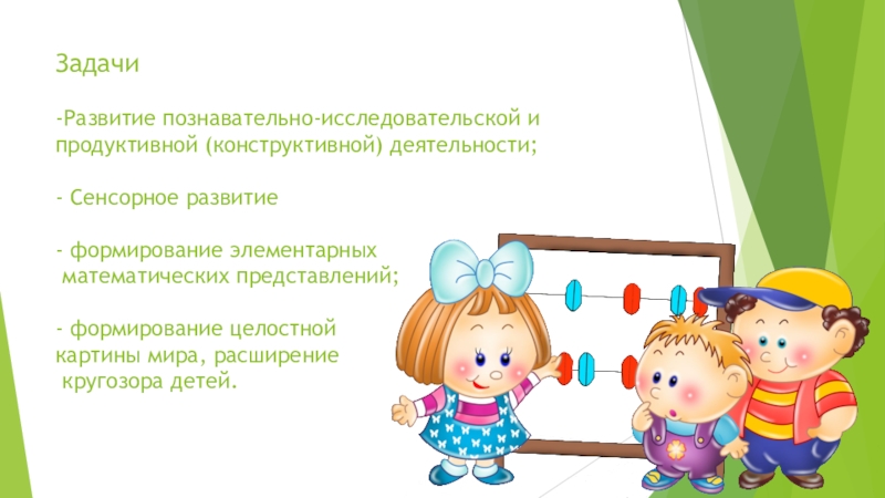 Слайд 4Задачи -Развитие познавательно-исследовательской и продуктивной (конструктивной) деятельности; - Сенсорное развитие - формирование элементарных математических