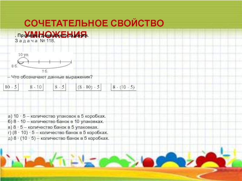 г) (8 · 10) · 5 – количество банок в 5 коробках.