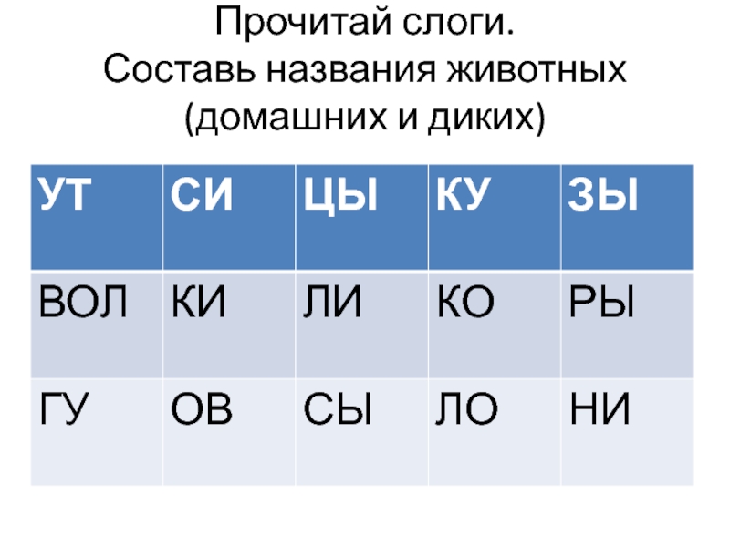 Слайд 2Прочитай слоги. Составь названия животных (домашних и диких)
