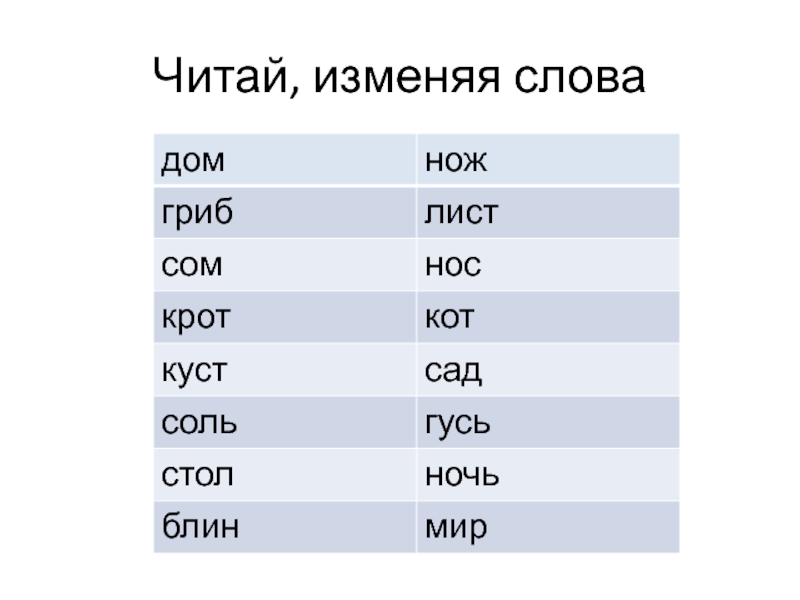 ЧИТАЙ СЛОВАРОЗА, ЛОЖКА, МЫШИ, НОС, ЛУК, МАЛИНА, ЛЁД, РАМА, НОЧЬ, МЕЛ, ЛИМОН, РЕКА, ЛЫЖИ, МЕДВЕДЬ, РОГ, НОРА,