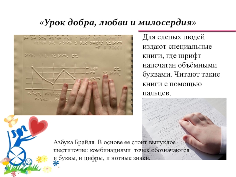 Азбука Брайля. В основе ее стоит выпуклое шеститочие: комбинациями точек обозначаются и буквы, и цифры, и нотные знаки.