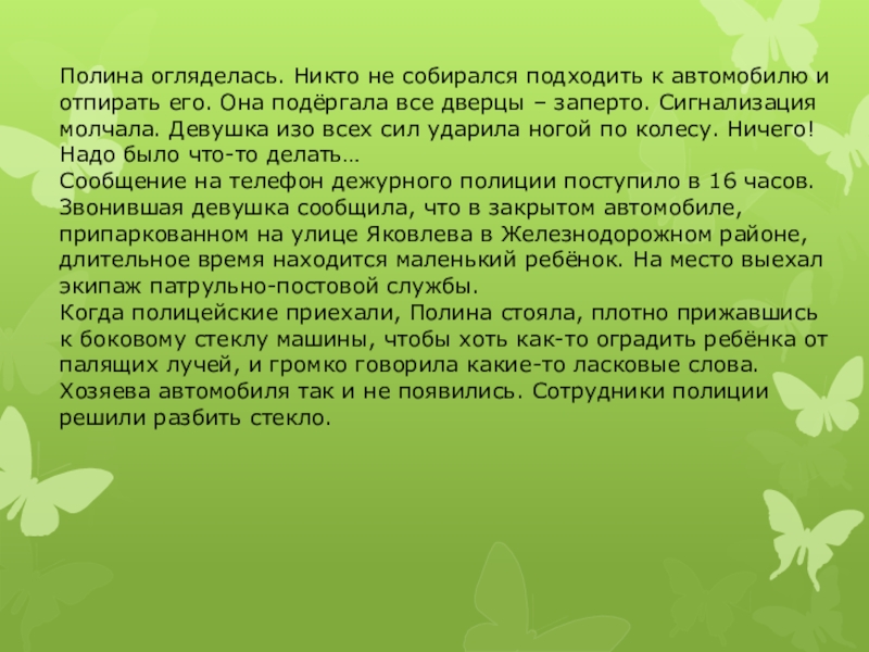 Слайд 8Полина огляделась. Никто не собирался подходить к автомобилю и отпирать его.