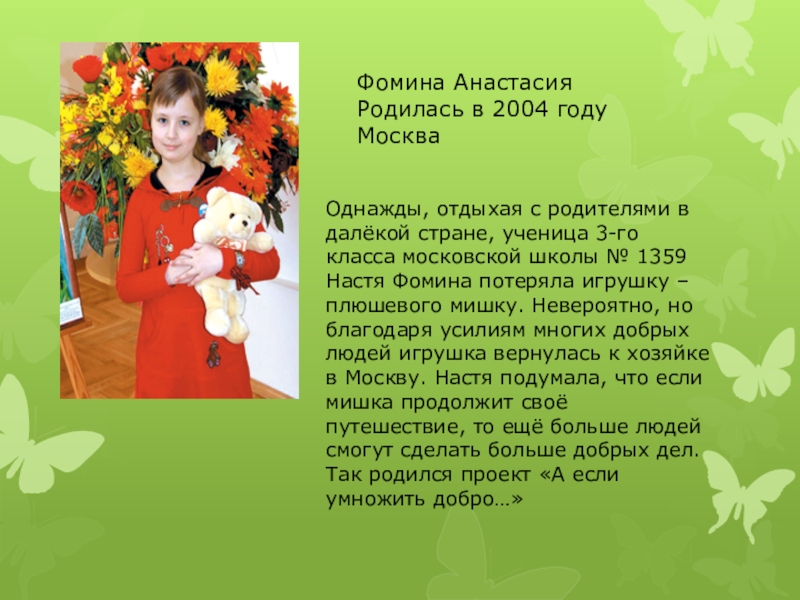 ученица 3-го класса московской школы № 1359 Настя Фомина потеряла игрушку – плюшевого мишку. Невероятно, но благодаря усилиям многих добрых людей игрушка вернулась к хозяйке в Москву. Настя подумала, что если мишка продолжит своё путешествие, то ещё больше людей смогут сделать больше добрых дел. Так родился проект «А если умножить добро…»