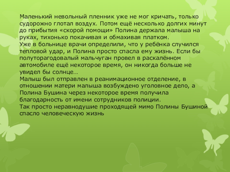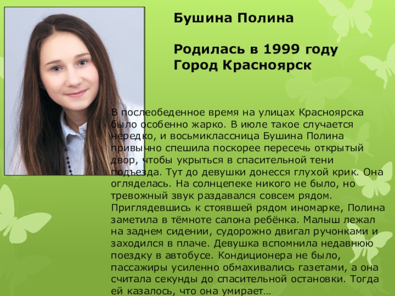 было особенно жарко. В июле такое случается нередко, и восьмиклассница Бушина Полина привычно спешила поскорее пересечь открытый двор, чтобы укрыться в спасительной тени подъезда. Тут до девушки донесся глухой крик. Она огляделась. На солнцепеке никого не было, но тревожный звук раздавался совсем рядом. Приглядевшись к стоявшей рядом иномарке, Полина заметила в тёмноте салона ребёнка. Малыш лежал на заднем сидении, судорожно двигал ручонками и заходился в плаче. Девушка вспомнила недавнюю поездку в автобусе. Кондиционера не было, пассажиры усиленно обмахивались газетами, а она считала секунды до спасительной остановки. Тогда ей казалось, что она умирает…