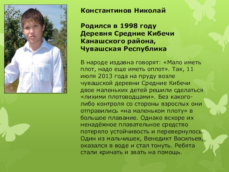 народе издавна говорят: «Мало иметь плот, надо еще иметь оплот». Так, 11 июля 2013 года на пруду возле чувашской деревни Средние Кибечи двое маленьких детей решили сделаться «лихими плотоводцами». Без какого-либо контроля со стороны взрослых они отправились «на маленьком плоту» в большое плавание. Однако вскоре их ненадёжное плавательное средство потеряло устойчивость и перевернулось. Один из мальчишек, Венедикт Васильев, оказался в воде и стал тонуть. Ребята стали кричать и звать на помощь.