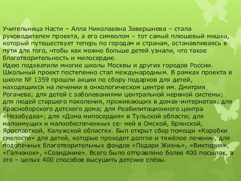 Слайд 15Учительница Насти – Алла Николаевна Завершнева – стала руководителем проекта, а
