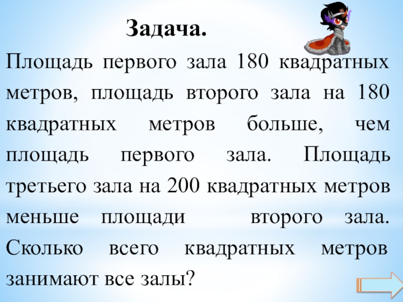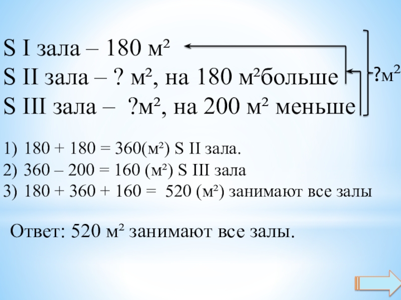 180 + 360 + 160 = 520 (м²) занимают все залы