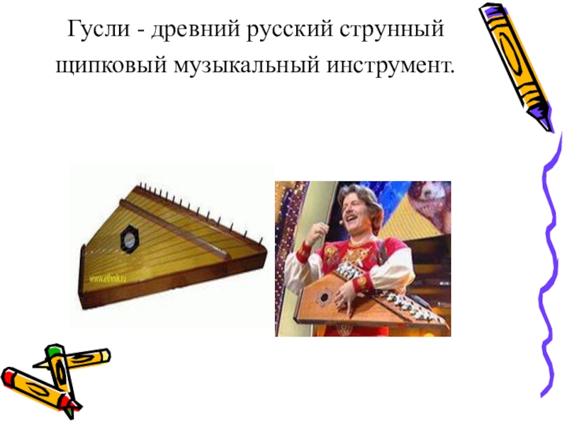Слайд 8Гусли - древний русский струнный щипковый музыкальный инструмент.