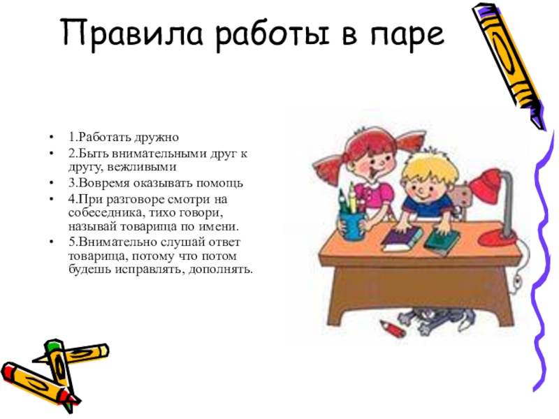 Правила работы в паре1.Работать дружно2.Быть внимательными друг к другу, вежливыми3.Вовремя оказывать помощь 4.При разговоре смотри на собеседника,