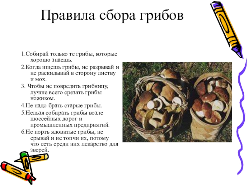 Правила сбора грибов1.Собирай только те грибы, которые хорошо знаешь. 2.Когда ищешь грибы, не разрывай и не раскидывай