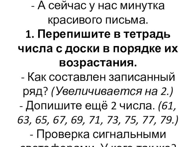 числа с доски в порядке их возрастания. - Как составлен записанный ряд? (Увеличивается на 2.) - Допишите ещё 2 числа. (61, 63, 65, 67, 69, 71, 73, 75, 77, 79.) - Проверка сигнальными светофорами. У кого так же?