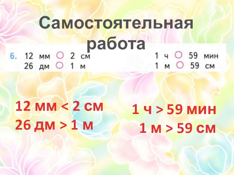 Самостоятельная работа12 мм < 2 см26 дм > 1 м1 ч > 59 мин 1 м >