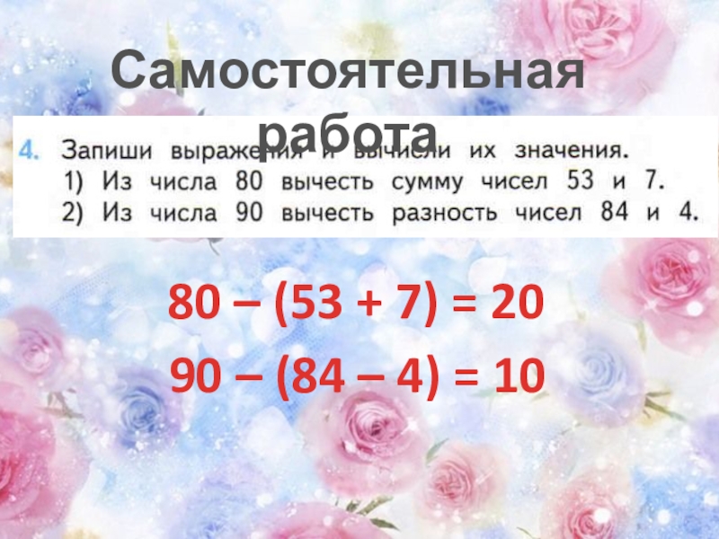 Самостоятельная работа80 – (53 + 7) = 2090 – (84 – 4) = 10