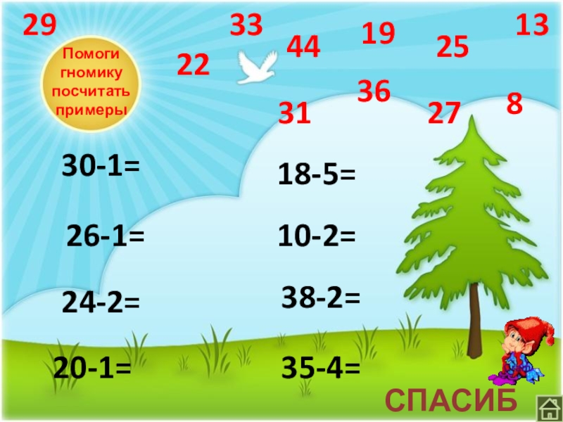 Помоги  гномику  посчитать примеры30-1=26-1=24-2=20-1=18-5=10-2=38-2=35-4=274433362582913311922СПАСИБО !