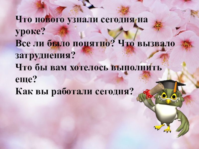 Что нового узнали сегодня на уроке?Все ли было понятно? Что вызвало затруднения?Что бы вам хотелось выполнить еще?Как