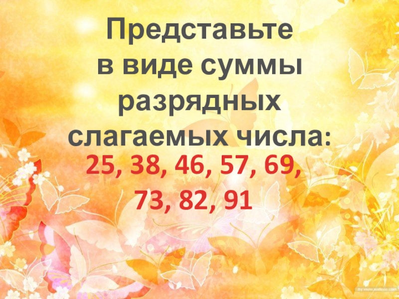 Представьте в виде суммы разрядных слагаемых числа: 25, 38, 46, 57, 69, 73, 82, 91