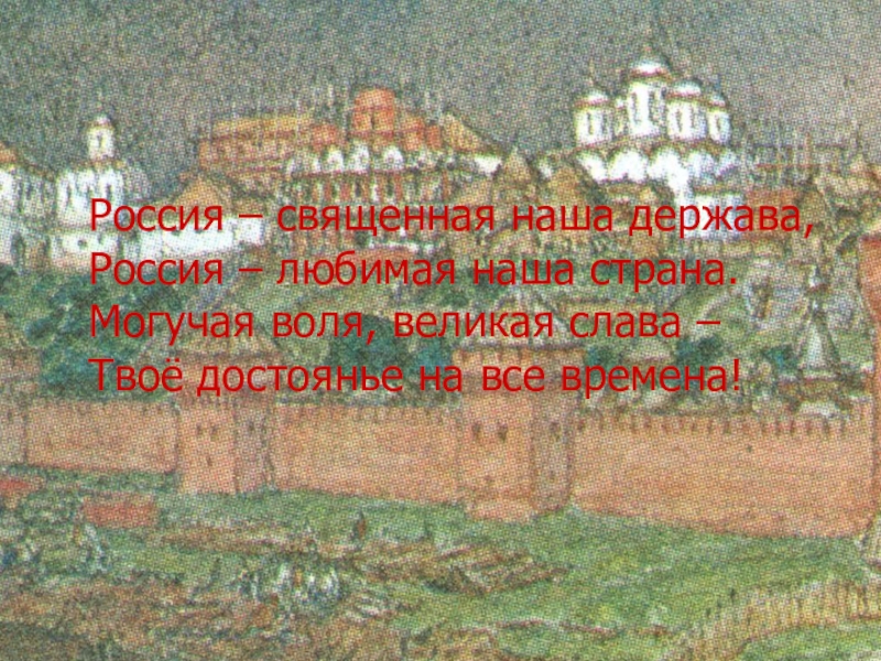 Россия – священная наша держава,Россия – любимая наша страна.Могучая воля, великая слава –Твоё достоянье на все времена!