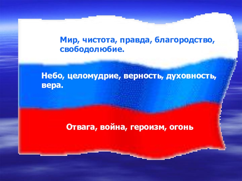 Отвага, война, героизм, огоньНебо, целомудрие, верность, духовность,вера.Мир, чистота, правда, благородство,свободолюбие.