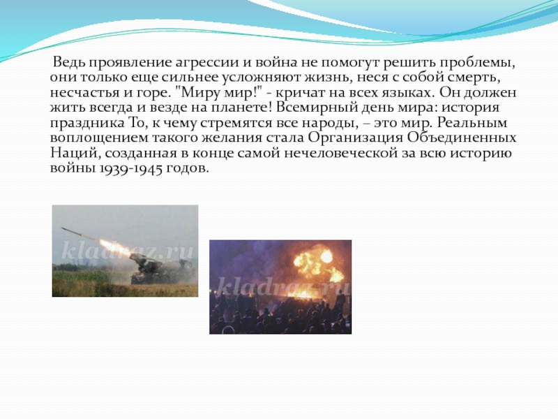 Слайд 10 Ведь проявление агрессии и война не помогут решить